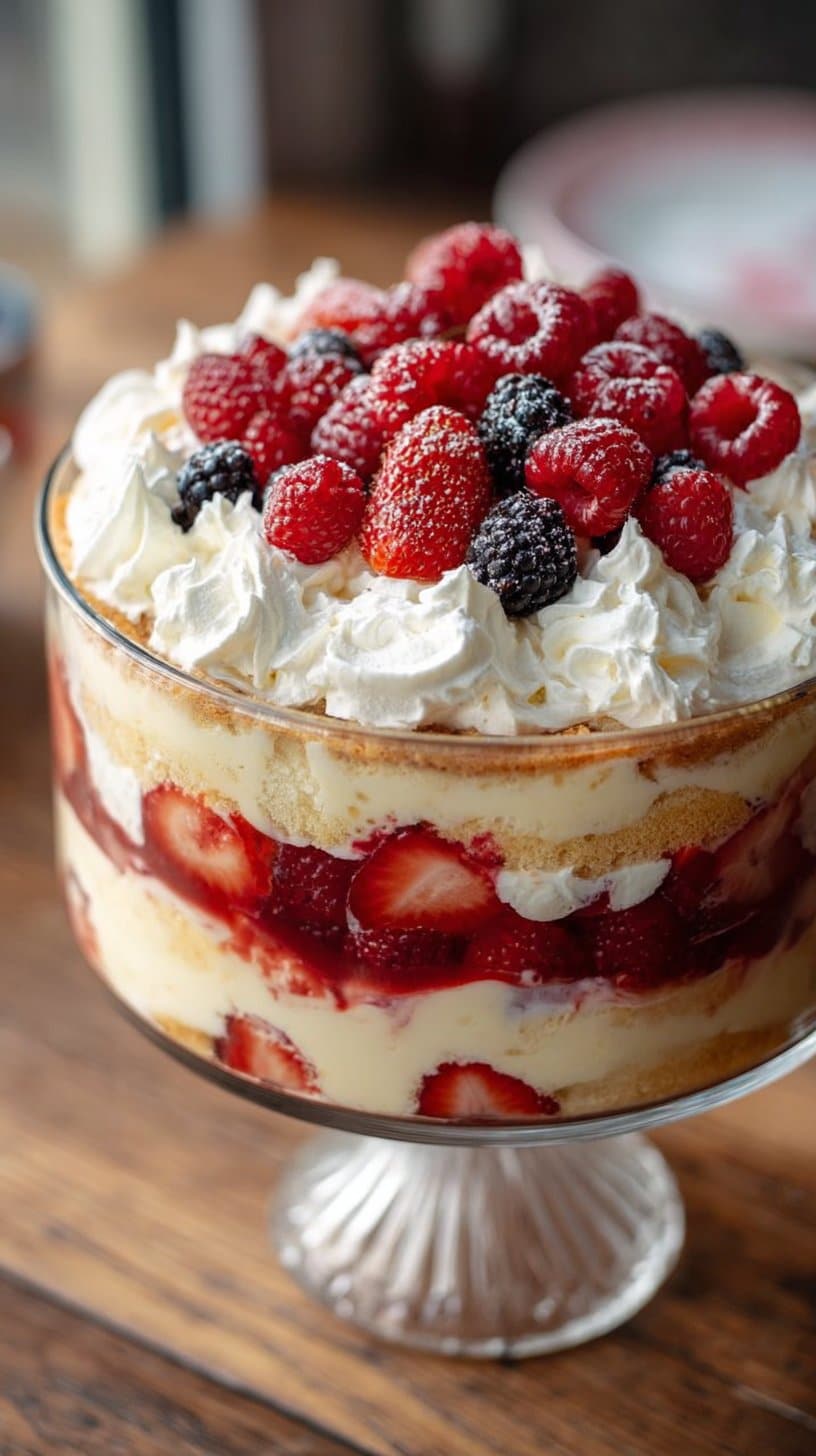 This berry trifle is light and bright. You make it fast with a few parts. It uses cake, berries, custard, cream, and a touch of sherry. Many people like the sweet and soft mix. See a simple berry trifle for a similar idea.
