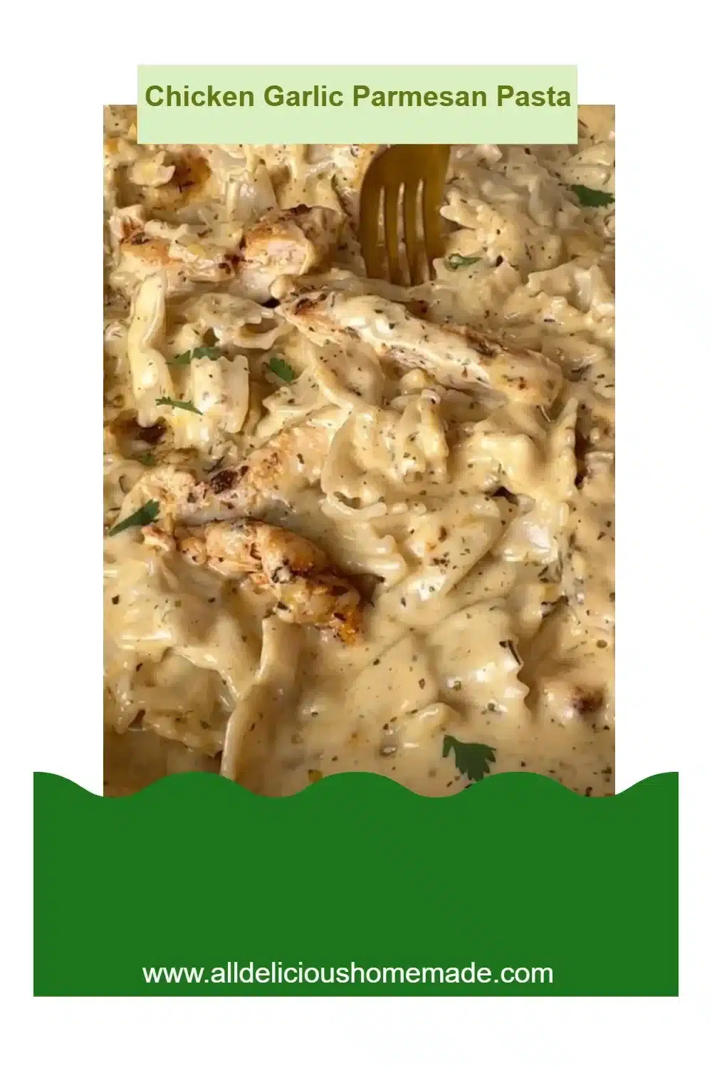 Serve Chicken Garlic Parmesan Pasta warm in bowls. You can top each serving with extra grated Parmesan cheese and a sprinkle of freshly chopped parsley for added flavor and presentation. This dish pairs well with a side salad or garlic bread.