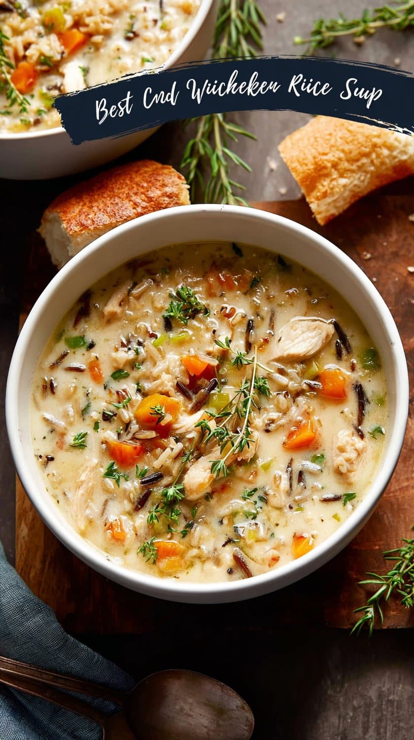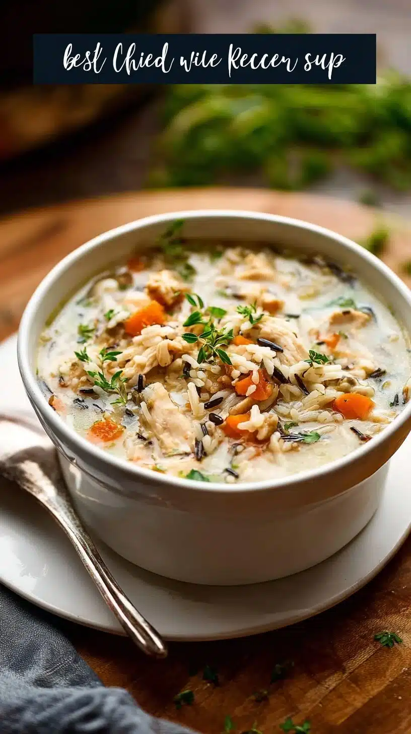 A warm and hearty soup filled with tender chicken, wild rice, and a rich cream base, perfect for sharing on cold days.