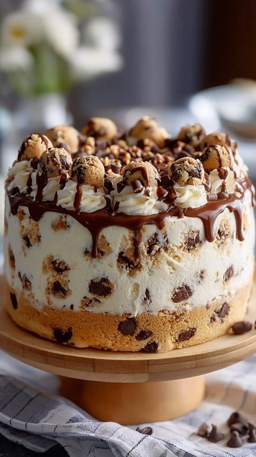 A delightful cake combining soft cookie layers, cookie dough bits, and ice cream, perfect for parties and warm days.