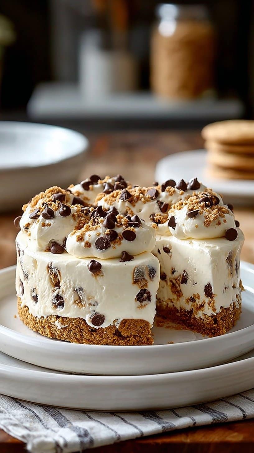 This ice cream cake makes a warm day feel fun. It uses big chocolate chip cookies and soft vanilla ice cream. You can make it fast and share it with friends.