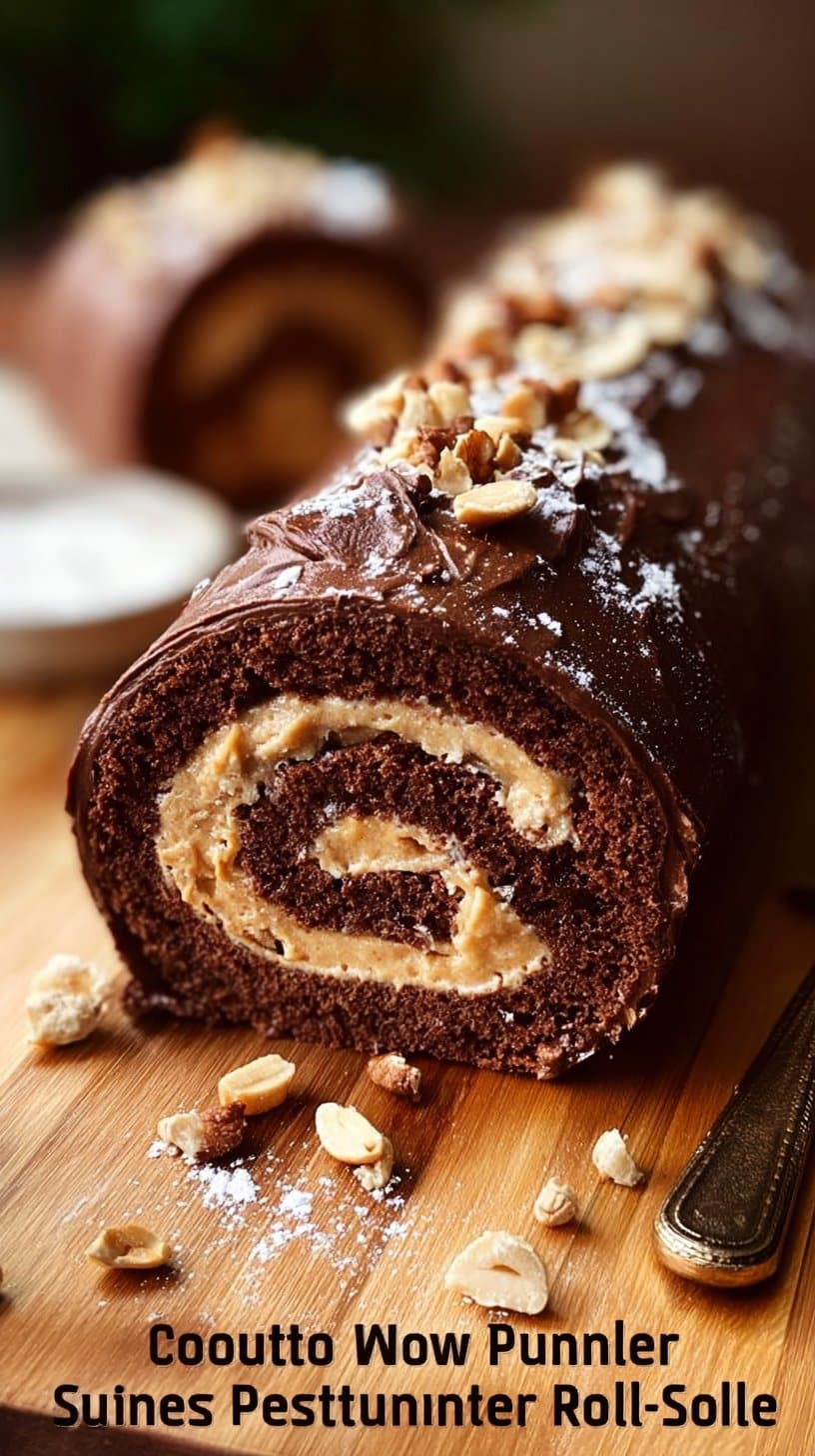 This cake is fun and nice. It makes a soft chocolate cake with a peanut butter fill. You can change it for a small party or a snack. See a similar cake roulade for more ideas.