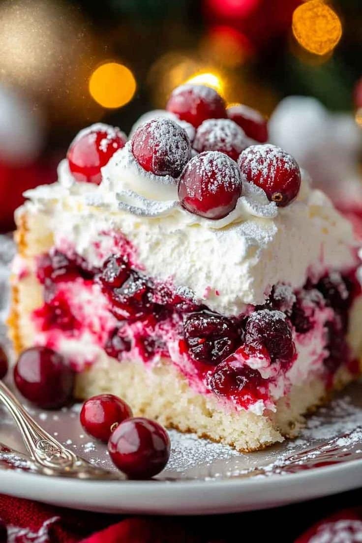 A festive dessert featuring a moist white cake soaked in tangy cranberry sauce, topped with whipped cream and sprinkles, perfect for holiday gatherings.