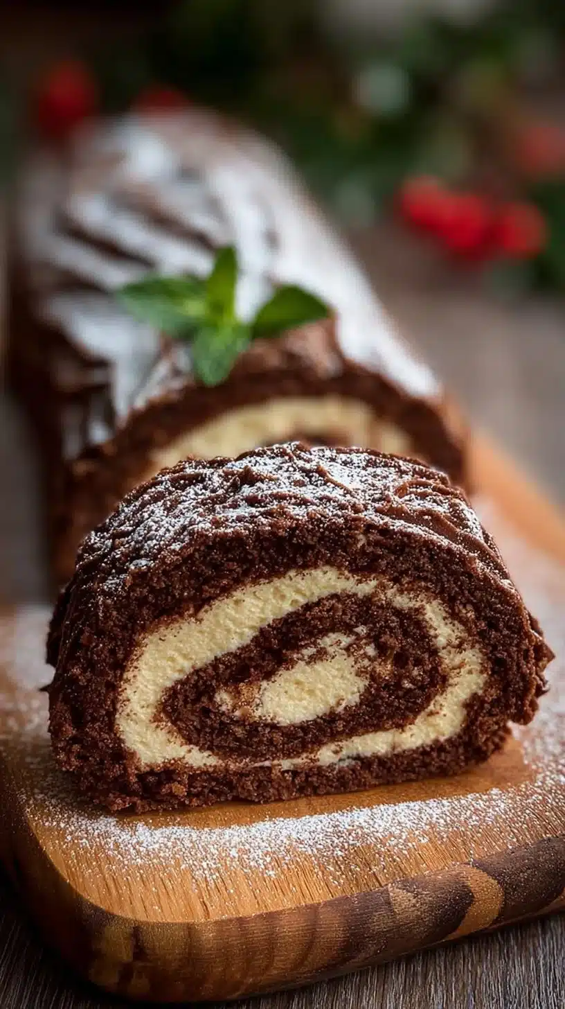 Slice the cake with a sharp serrated knife. Serve on a flat plate so the log look stays neat. Add a dust of powdered sugar like snow. For a fun match, serve with a warm drink or a light berry sauce and try ideas like this chocolate peanut butter roulade for other plates.