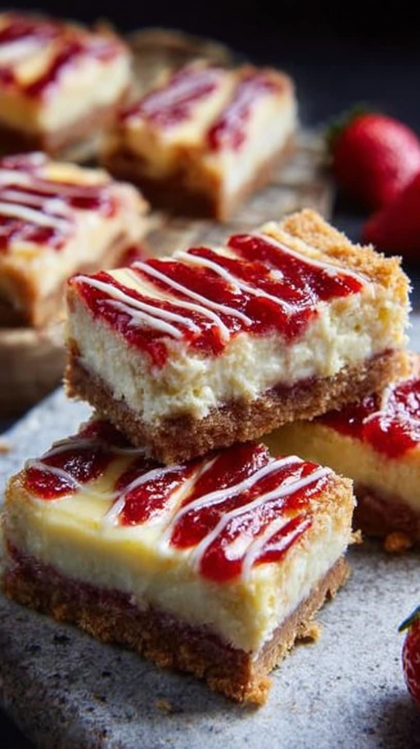 This is an easy take on a classic dessert. The bars have a thin graham crust, a smooth cream cheese middle, and a bright strawberry top. You can make them for a party, for work, or for a quiet night at home. Try a similar cookie idea like strawberry cheesecake cookies if you want a small bite.