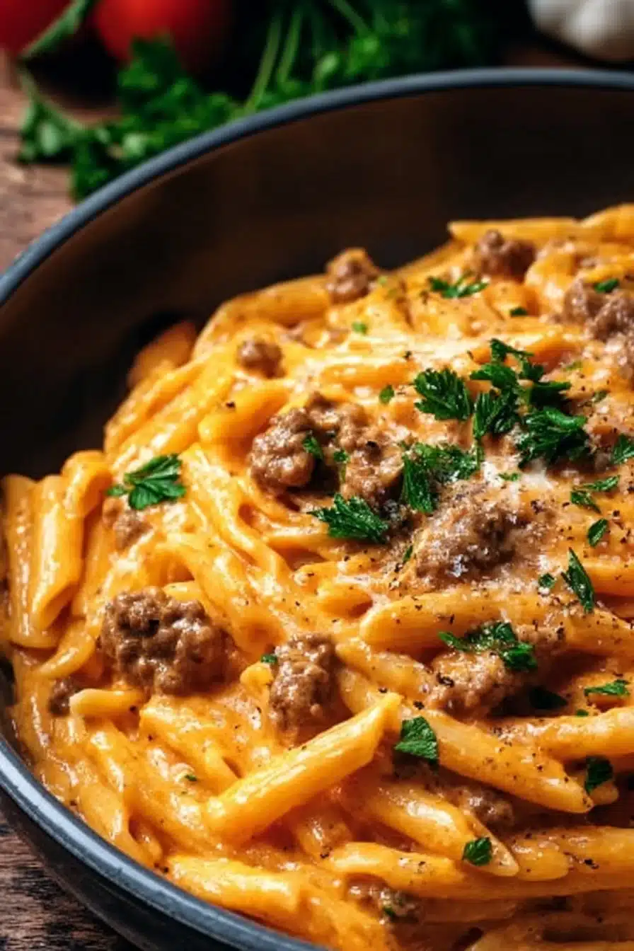 - Serve the creamy beef pasta garnished with fresh basil or parsley.