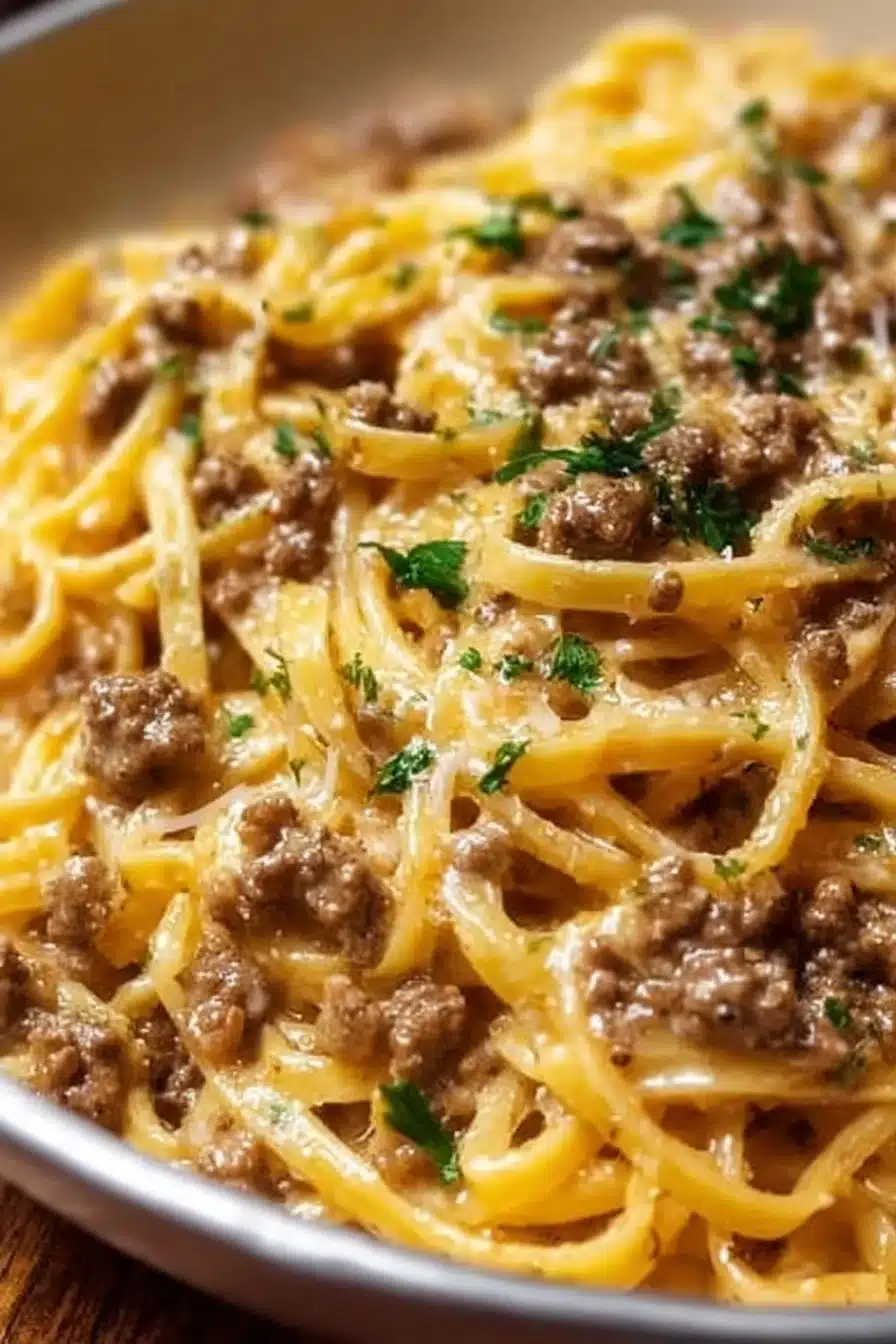 A comforting creamy pasta dish combining garlic, butter, and hearty ground beef, perfect for busy weeknights.