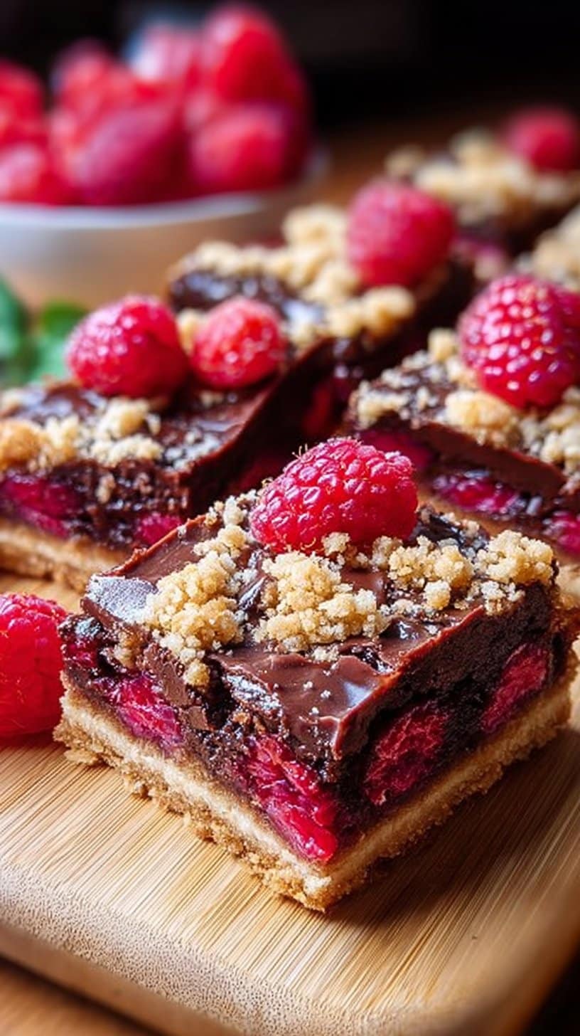 Rich and bright pie bars featuring dark chocolate, sweet milk, and fresh raspberries, perfect for a quick showy dessert.