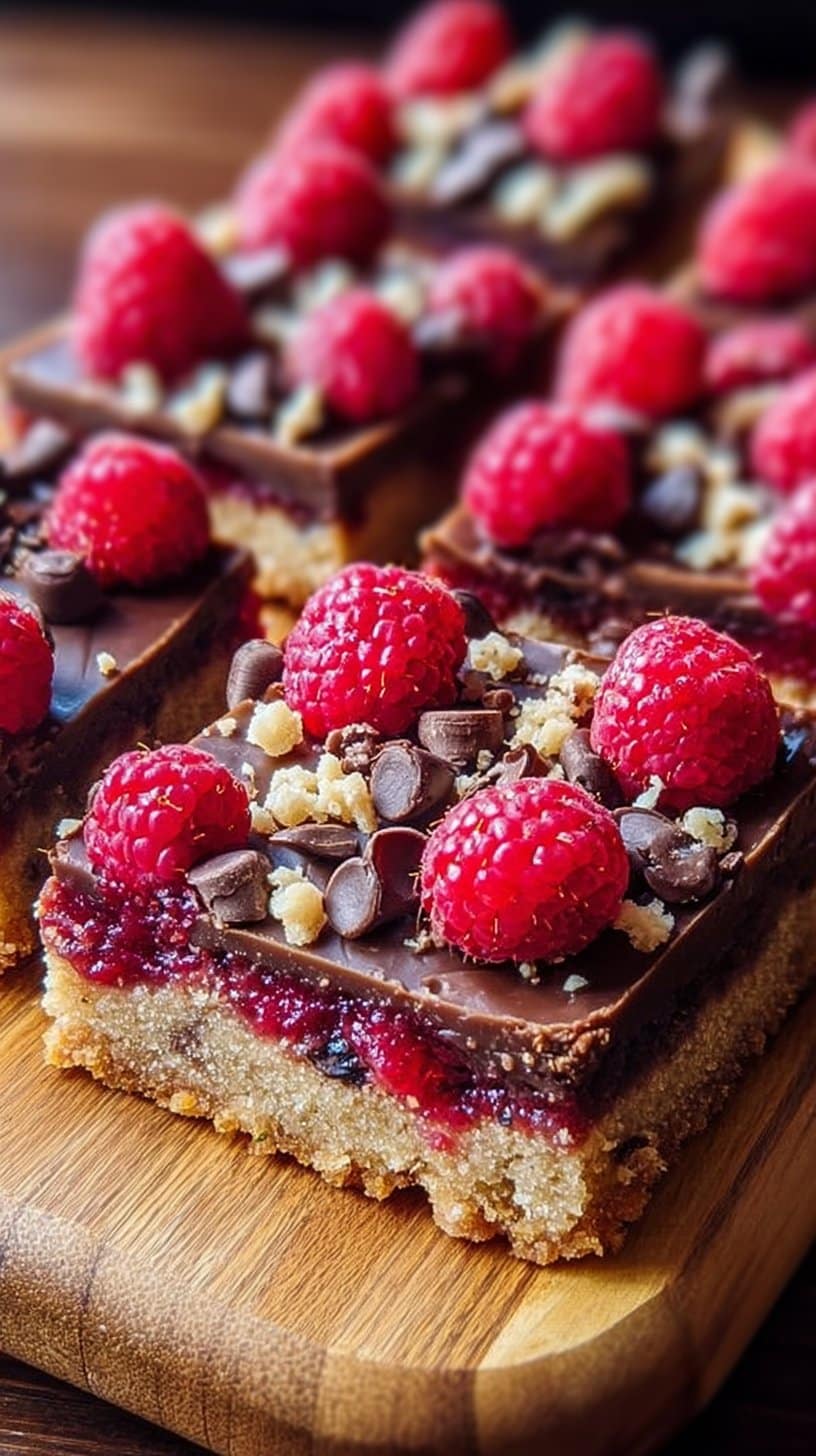 This is a simple bar with dark chocolate and fresh raspberries. It has a short crust, a rich chocolate layer, and bright fruit on top. Many people will like the mix of deep chocolate and tart berry. If you like other raspberry treats, try this chocolate raspberry cake for a different take.