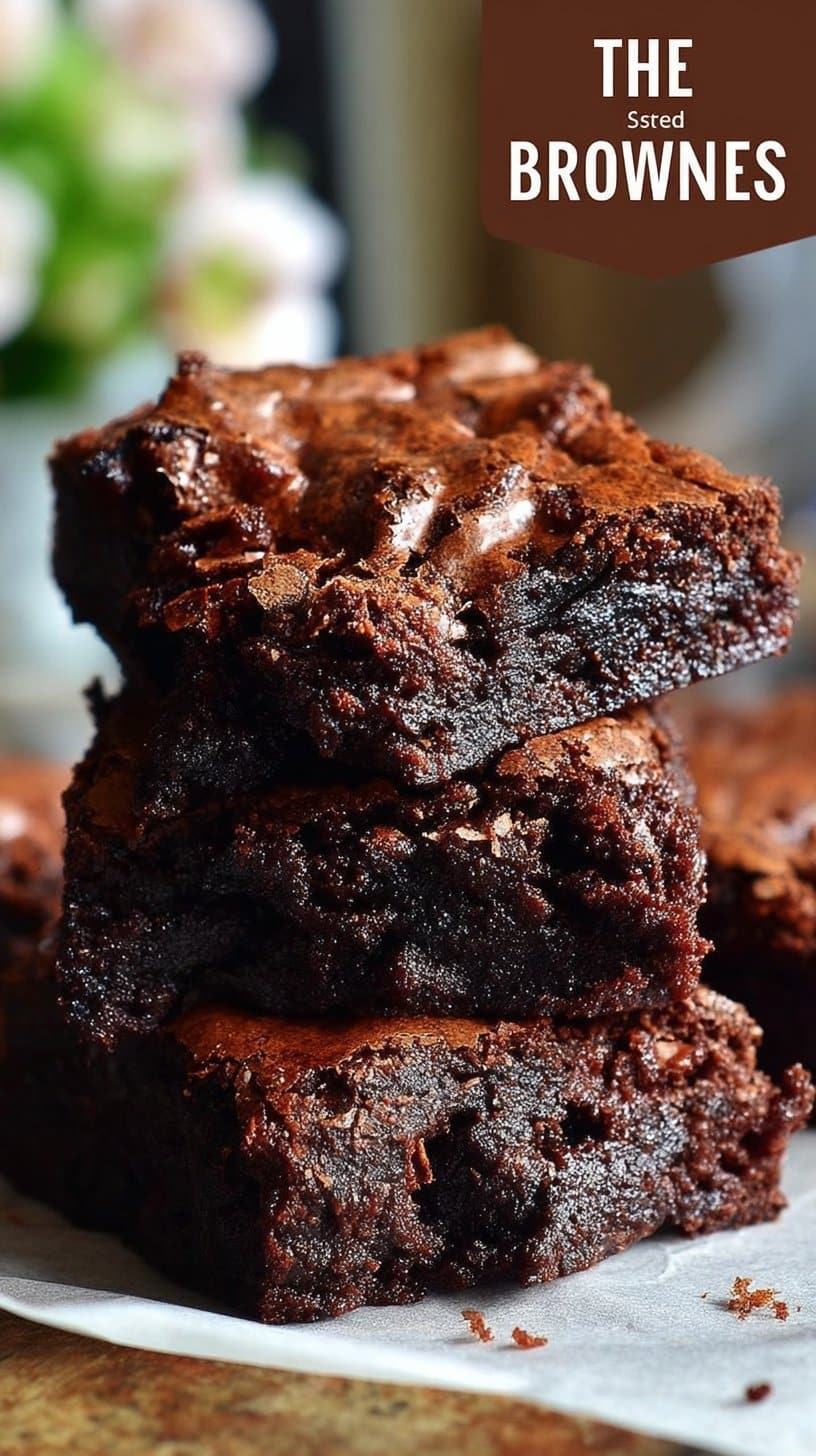 These fudgy brownies use simple things. You can make them fast. They taste rich and soft. The top can be shiny and crackly. Kids and adults will like them.