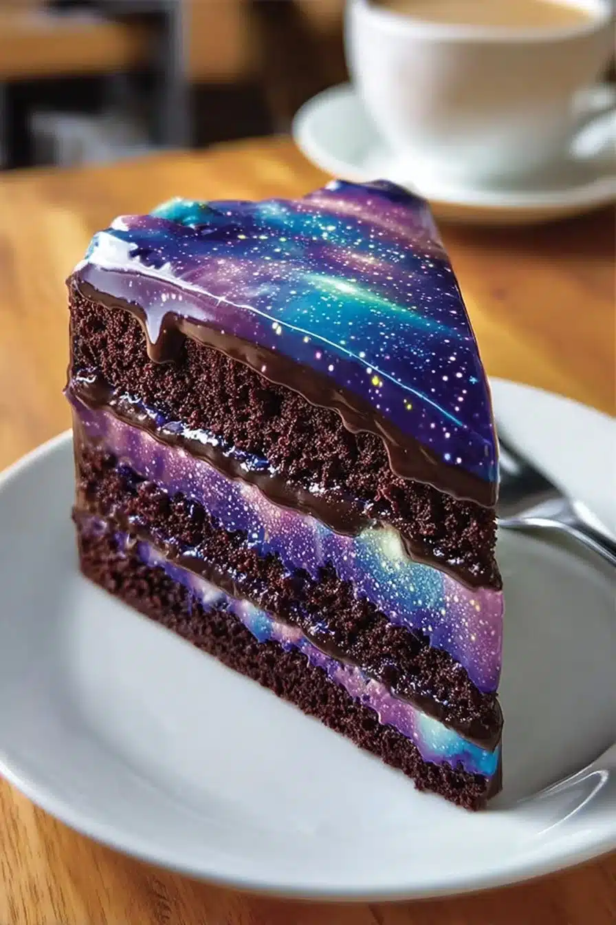 A stunning cake with rich chocolate flavor and a glossy galaxy-themed glaze, perfect for celebrations.