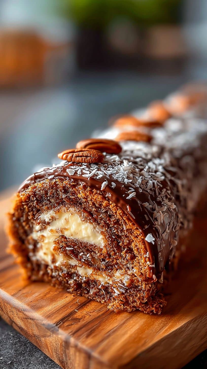 An easy and impressive German Chocolate Cake Roll filled with a rich coconut and pecan filling, perfect for parties or quiet treats.