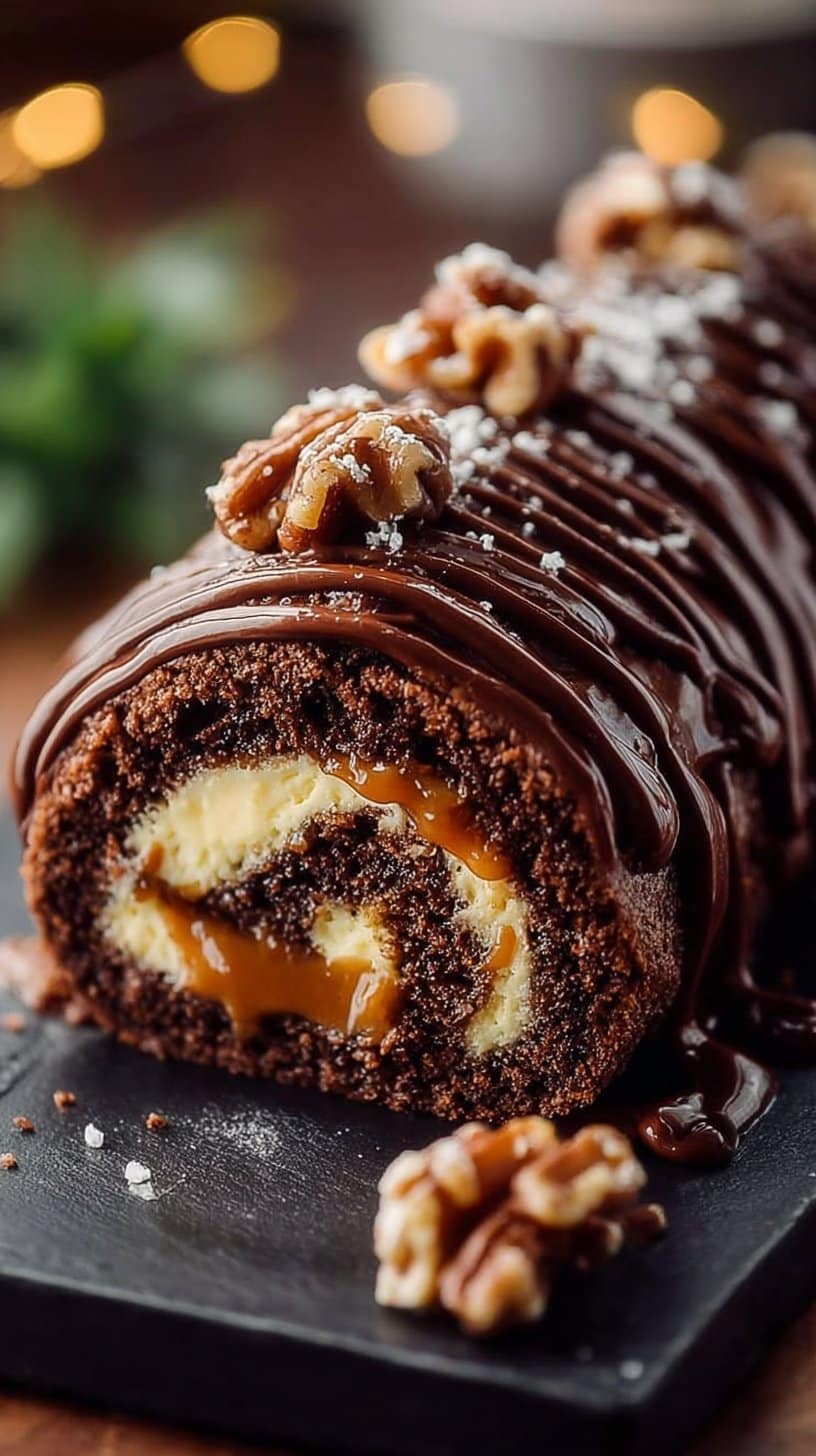 A delicious cake roll filled with caramel and nuts, coated in chocolate ganache for a delightful treat.