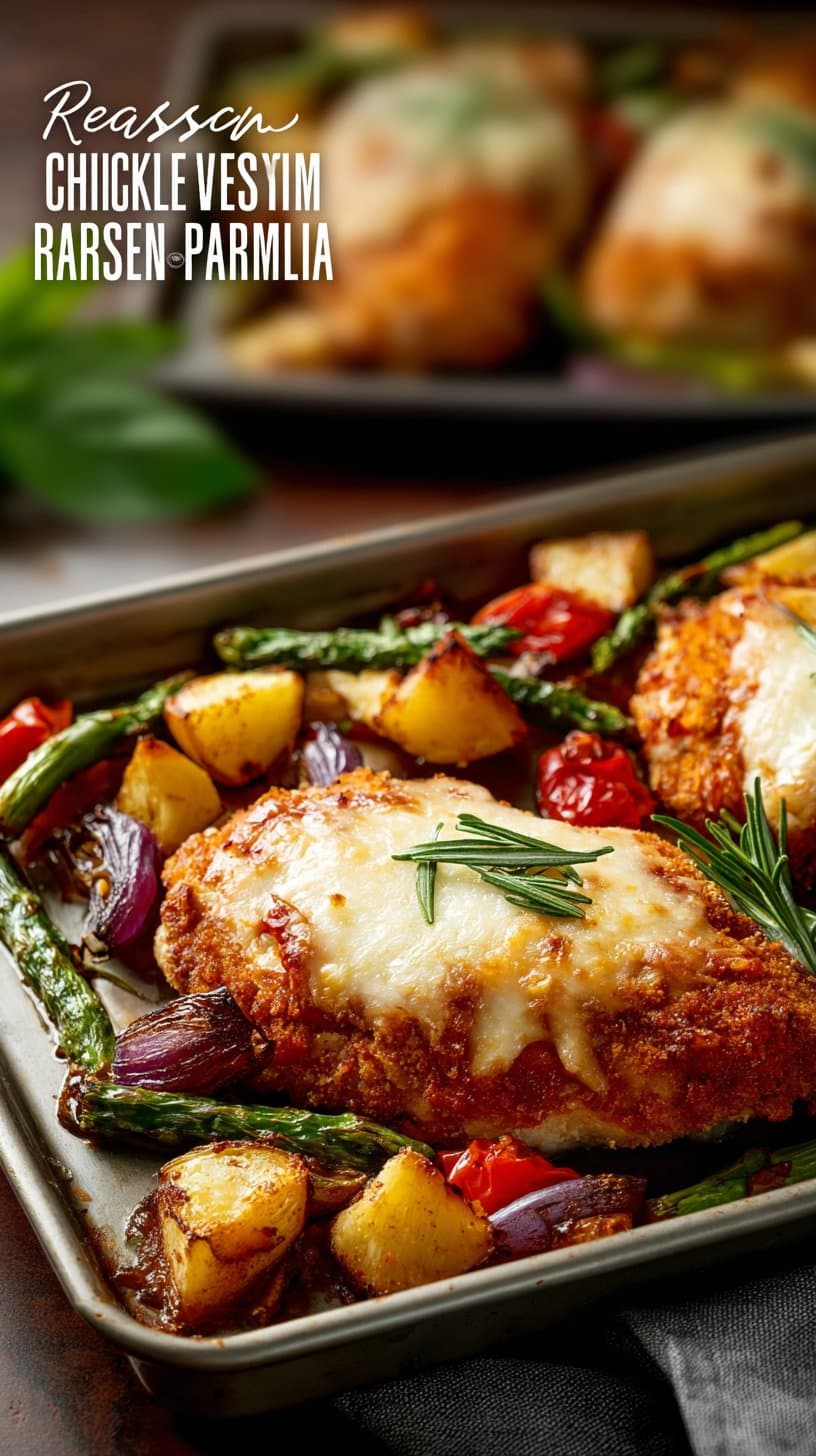 A light and fresh take on classic chicken parmesan, featuring roasted vegetables and melted cheese, all made on one sheet pan for easy cleanup.