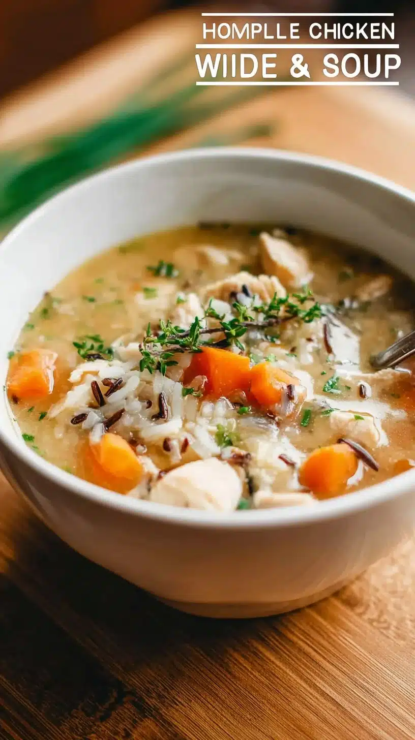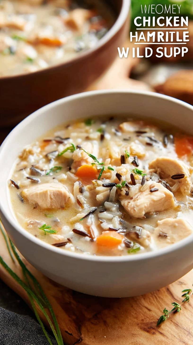 A warm and creamy soup combining chicken, wild rice, and vegetables, perfect for a hearty meal.