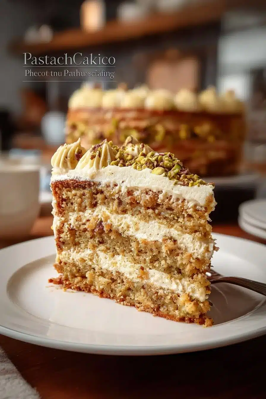 A delightful pistachio cake topped with a creamy pistachio buttercream frosting, perfect for any celebration.