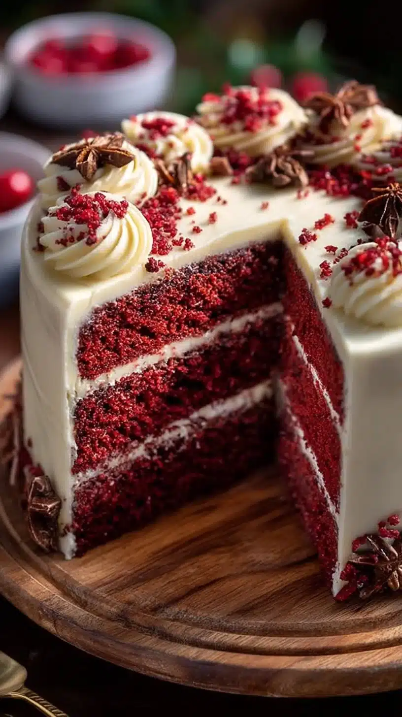 A bright and soft cake perfect for holidays, featuring red velvet with cream cheese frosting.
