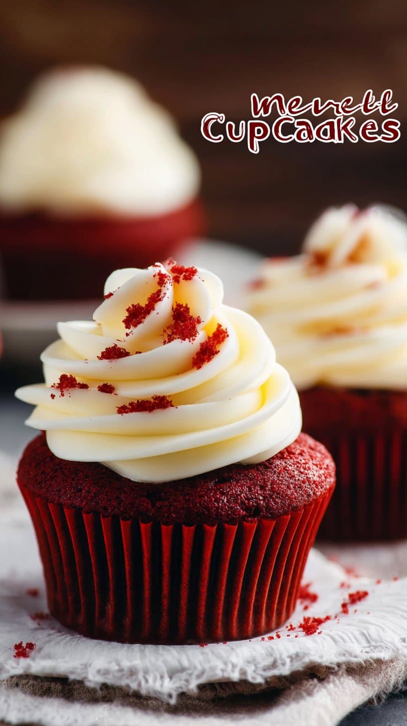 Soft and moist red velvet cupcakes topped with creamy cream cheese frosting, perfect for parties or gifts.