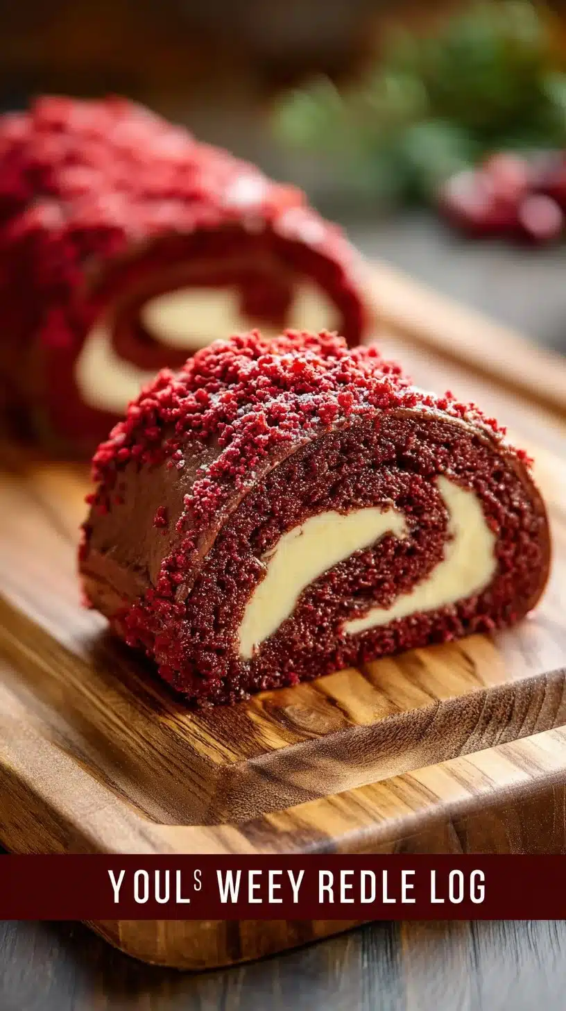 A vibrant and soft Red Velvet Yule Log perfect for festive celebrations, filled with smooth cream cheese frosting.