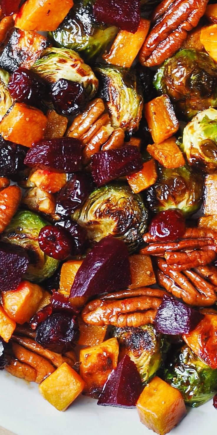 A colorful and nutritious salad featuring roasted butternut squash, Brussels sprouts, and crunchy pecans with a hint of sweetness from cranberries.
