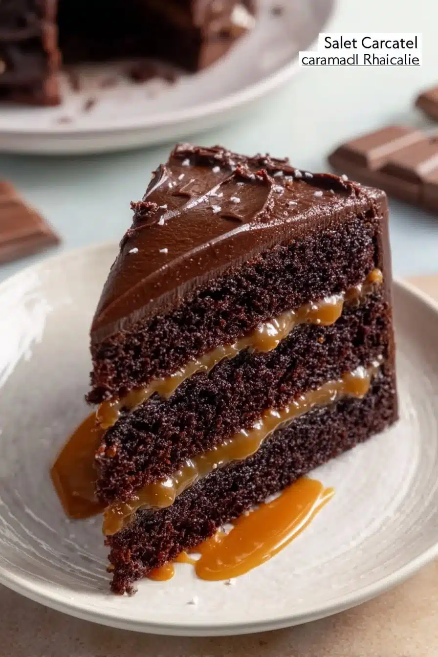 A rich chocolate cake layered with smooth salted caramel and creamy fudge frosting, perfect for special occasions or a sweet indulgence.