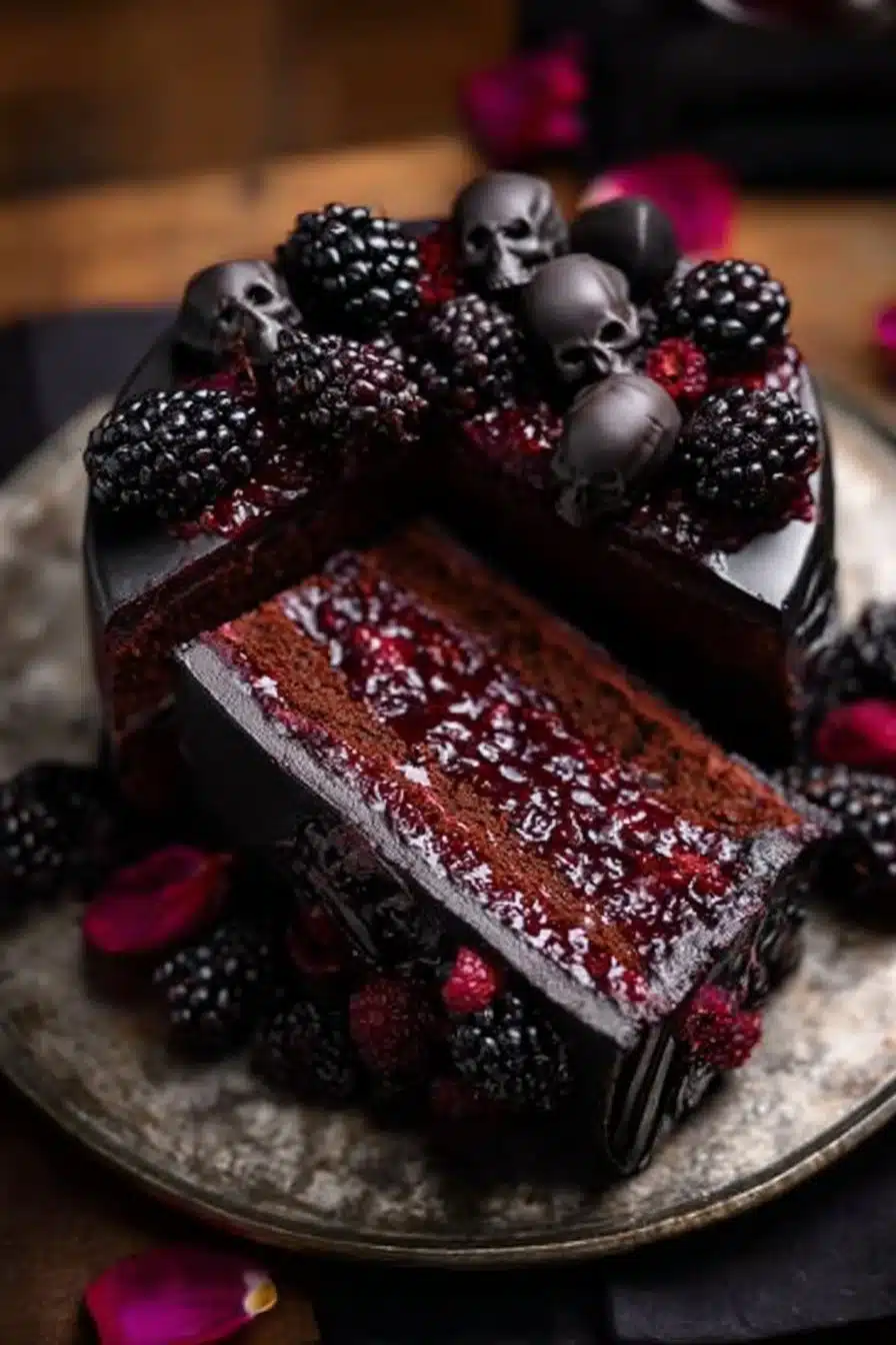 Assembly: Once the cakes are cooled, place one layer on a serving plate. Spread a layer of blackberry compote on top, then add some frosting. Place the second cake layer on top, and frost the entire cake with the black cocoa frosting. Decorate with chocolate skulls, fresh blackberries, and dried rose petals.
