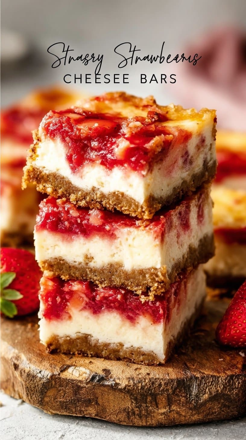 Deliciously creamy strawberry cheesecake bars with a crisp graham cracker crust. Perfect for parties or a calm night at home.
