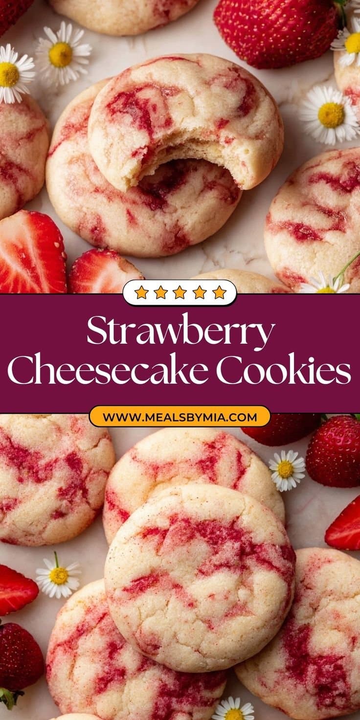 Delicious cookies that combine the flavors of creamy cheesecake and fresh strawberries, perfect for any occasion.