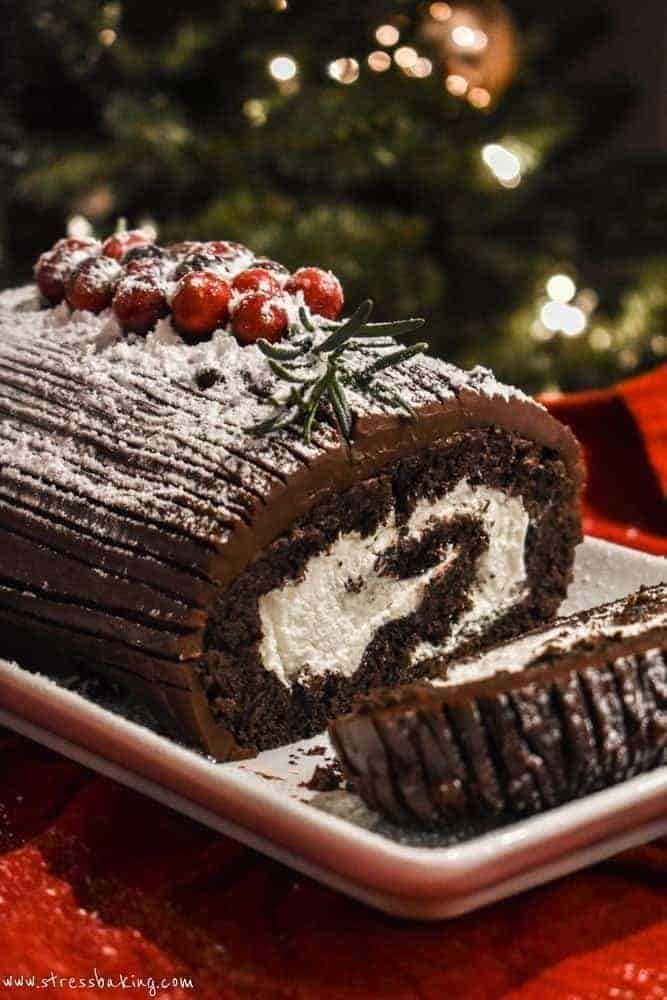 A delightful chocolate cake rolled with a creamy filling, perfect for holiday celebrations.