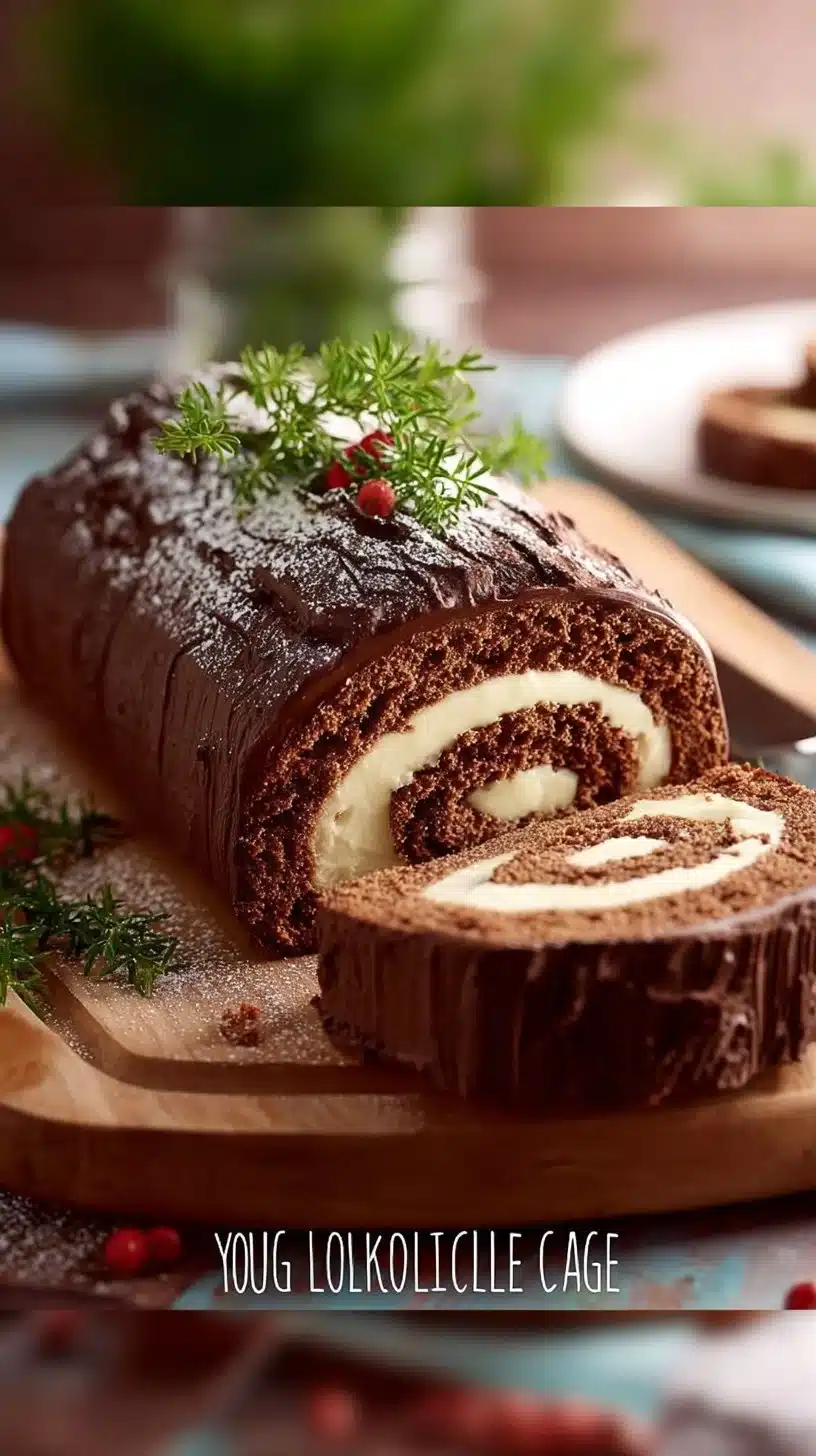 A festive Yule Log Cake that resembles a wooden log, filled with cream and covered in chocolate ganache, perfect for holiday gatherings.